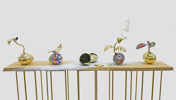 主題「TOMORROW」は〈明日への希望〉という意味を込め、副題「a Laboratory room」は〈実験室〉としました。東日本大震災で傷ついた人々は今、自らの力で、懸命に生きようとしています。生命が宿る〈卵〉をモチーフに、立ち上がるために挫折を味わいながらも、色々な試みを繰り返し、生きようとする人々の様子を表現しました。やがてハートの実がなる様に、〈希望〉や、〈明るい未来〉が、そして、悲しく辛い思いをした分、〈幸せ〉が訪れることをせつに祈る気持ちで制作しました。