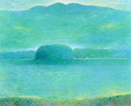 海上の靄が消え去る瞬間、名もない小さな島から、本土から、青くもあり緑でもあるなんとも柔かい静かな空気が流れる。そこへ黄色い光りが屈折しながら私の目に、心身までに差し込む。一瞬の自然から得る豊かな心のメッセージを、伝えたい思いで描いた印象風景「瀬戸の春」です。