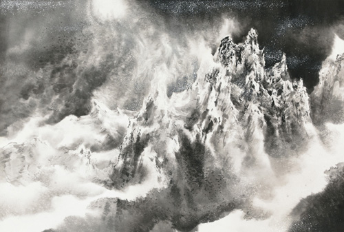 奇峰の中腹を巻き込む大気が、刻刻と山頂を這い上がり、天空へと舞上がるさまを表現した。